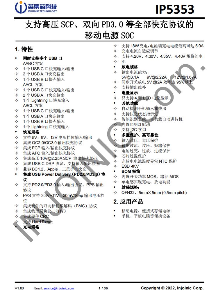 IP5353 是一款集成QC2.0/QC3.0/SCP輸出快充協(xié)議、FCP/AFC輸入輸出快充協(xié)議、TYPE-C/PD2.0/PD3.0輸入輸出協(xié)議、PPS輸出協(xié)議、BC1.2/Apple/三星的DCP協(xié)議,同時(shí)集成同步升/降壓轉(zhuǎn)換器、電池充電管理、電池電量指示等多功能的電源管理SOC,為快充移動(dòng)電源提供完整的電源解決方案??赏瑫r(shí)支持多個(gè)USB口輸出。